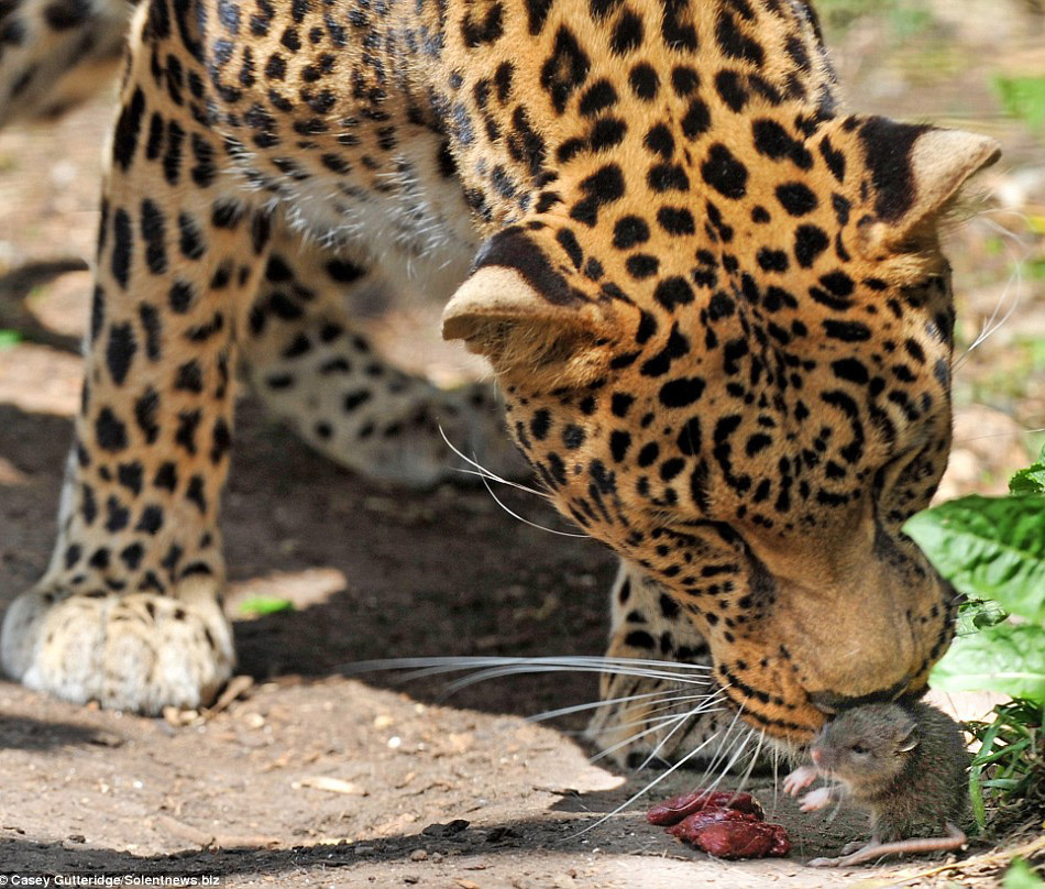 This extraordinary scene was captured by photography student Casey Gutteridge at the Santago Rare Leopard Project in Hertfordshire. The 19-year-old, from Potters Bar, Hertfordshire, who was photographing the leopard for a course project, was astounded by the mouse's behaviour. He said: "I have no idea where the mouse came from - he just appeared in the enclosure after the keeper had dropped in the meat for the leopard. He didn't take any notice of the leopard, just went straight over to the meat and started feeding himself. The leopard was pretty surprised - she bent down and sniffed the mouse and flinched a bit like she was scared. In the meantime the mouse just carried on eating like nothing had happened!" ![]() "It was amazing, even the keeper who had thrown the meat into the enclosure was shocked - he said he'd never seen anything like it before." ![]() ![]() |
